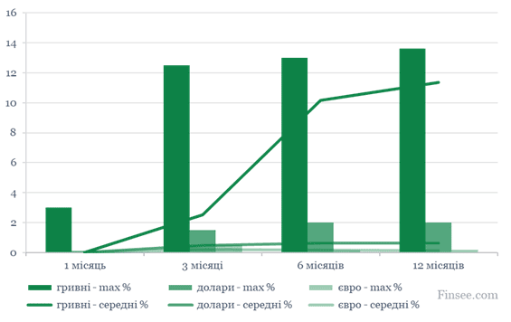 Максимальні та середні процентні ставки найбільш надійних банків України (для сум 100 000 грн, 5 000 дол. США, 5 000 євро).